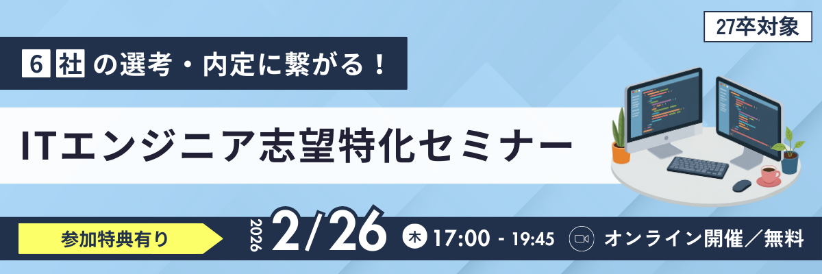 業界・職種・企業理解を深めるだけでなく、選考に直結する情報や特別ルートを知ることができるため、次の選考を“今より少し有利な状態”で進めるきっかけになるセミナーです。