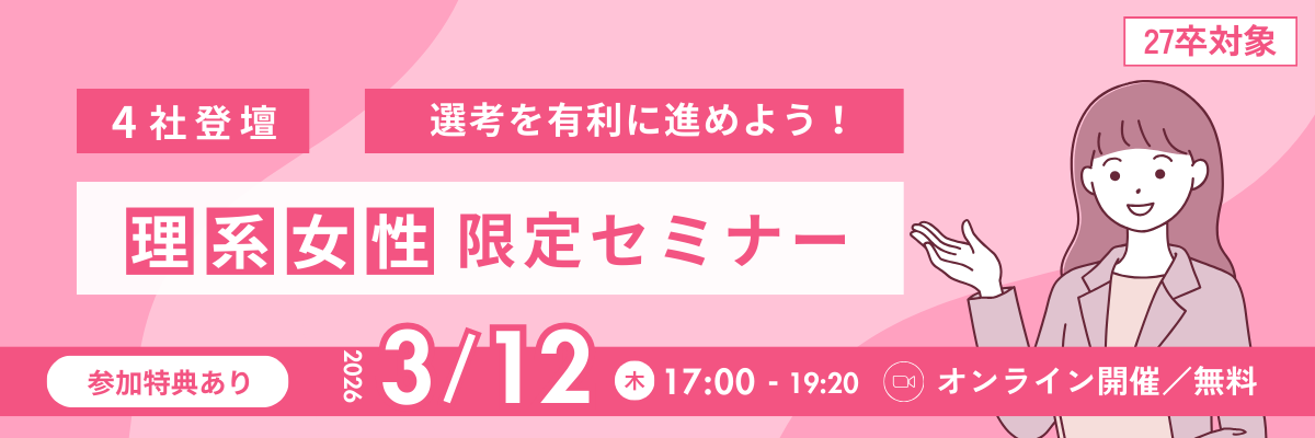 このセミナーに参加することで、企業と事前に接点を持った状態で選考に進むことができます。選考に進むことになった際、「どんな人かわからない状態」から始まるのではなく、顔や人柄を知ってもらったうえでスタートできることが、このセミナーならではの大きなメリットです。対象/こんな方におすすめ