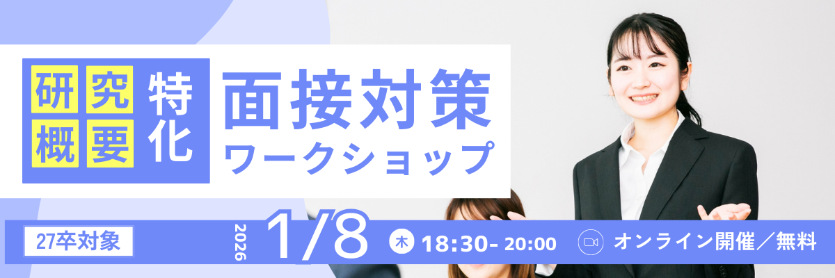 そんな方は、本選考が本格化する前に、 面接対策ワークショップ〈研究概要編〉で自信をつけましょう!