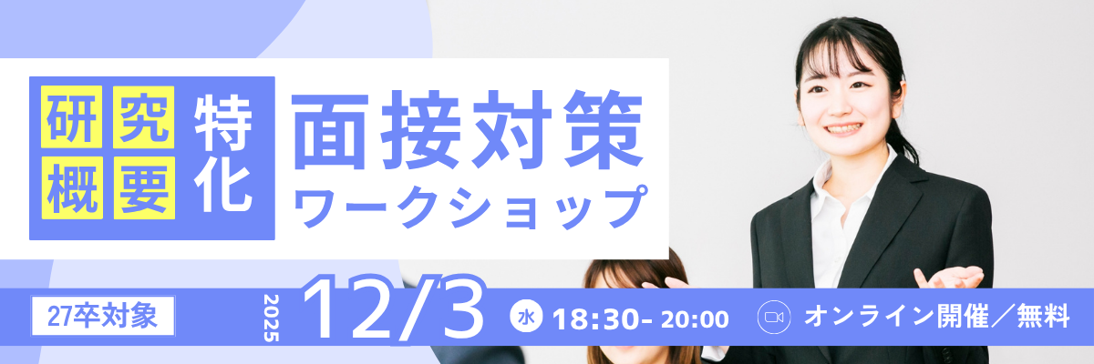 そんな方は、本選考が本格化する前に、 面接対策ワークショップ〈研究概要編〉で自信をつけましょう!