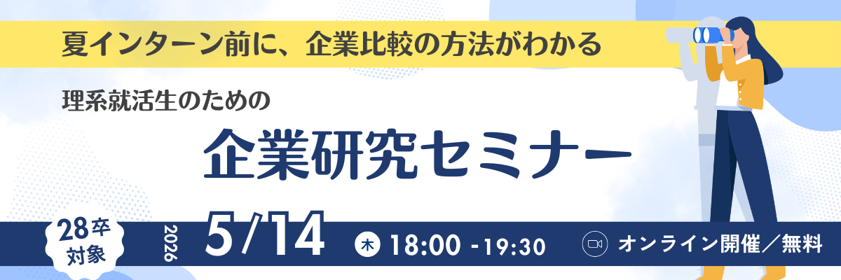 | 18:15〜18:55 | 企業研究のやり方講座 企業研究は何のためにやるのかと、企業研究の具体的な方法について解説します。また、企業比較の「判断軸」をつくる考え方も整理します。 |