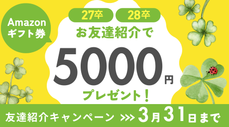27卒または28卒のお友達にTECH OFFERを紹介&条件達成で、紹介した方に5,000円分、紹介された方に500円分のAmazonギフトカードをプレゼント!